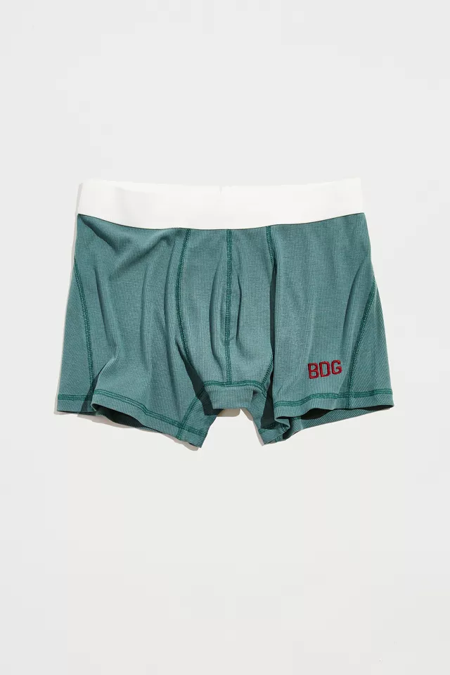 Fitted ribbed knit boxer briefs by the essential BDG label. Features a classic look and stretch fabrication with elasticated waistband. Finished with logo text at the leg. Only at Urban Outfitters.
